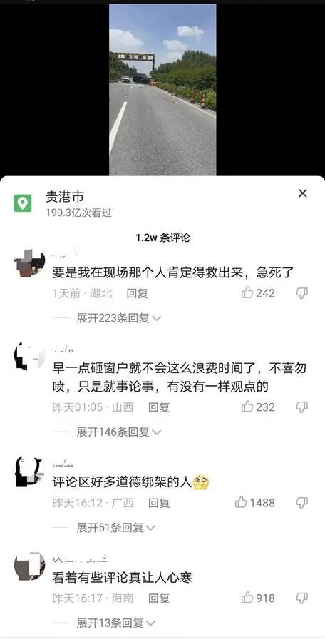 7月28日,柳北高速廣西貴港段,一輛雷克薩斯商務車發生事故後車門鎖死,3人被困車內,過路司機救出2人,1人不幸遇難(極目新聞此前報道)。現場視頻在網上傳播後,拍攝視頻並喊人救援的司機,包括現場其他參與救援的司機都不同程度地被網暴。29日,第一位下車喊人並記錄下現場的司機楊先生(化姓)發佈視頻稱,拍攝是為了記錄現場,之所以喊人,是因為僅憑他一個人的能力救不了車裏的人。