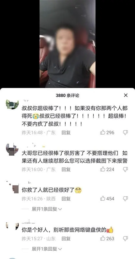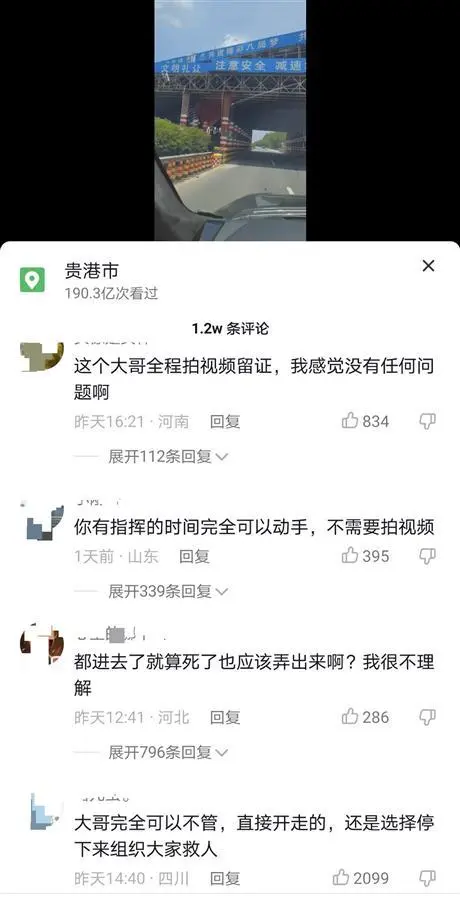 極目新聞記者注意到,就在楊先生髮布的現場救援視頻評論區內,有網友表示楊先生只會動口不動手,還有網友質疑救援現場幾名司機,“最後為什麼不砸側窗玻璃?最後一名司機都進去車內了,為什麼不將人拉出來?”更多的網友則是對幾位司機的救人行為給予肯定,有網友表示“隨時可能有爆炸的危險,他們也有自己的家人,不能對他們進行道德綁架”。