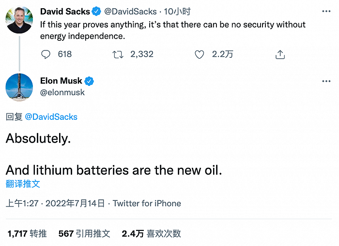 馬斯克表示:“鋰電池就是新的石油。”