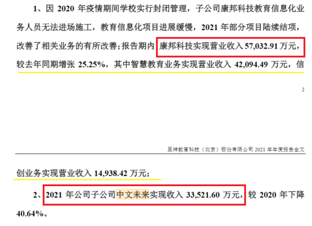 豆神教育質押擔保股權的兩家公司對其營收有着巨大作用。北京康邦科技有限公司(下稱“康邦科技”)為豆神教育智慧教育服務業務的主要公司。2021年全年,兩家公司的營收合計佔豆神教育總營收的80.70%。2022年第一季度康邦科技實現營收7675.28萬元,佔豆神教育總營收的45.74%。