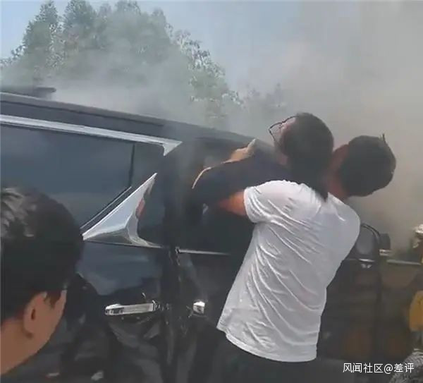 而此時濃煙已經快蓋住整輛車身,眼看整輛車都要燒起來了,大家只能都撤到一旁,沒過多久,大火和濃煙就吞噬了整輛車。