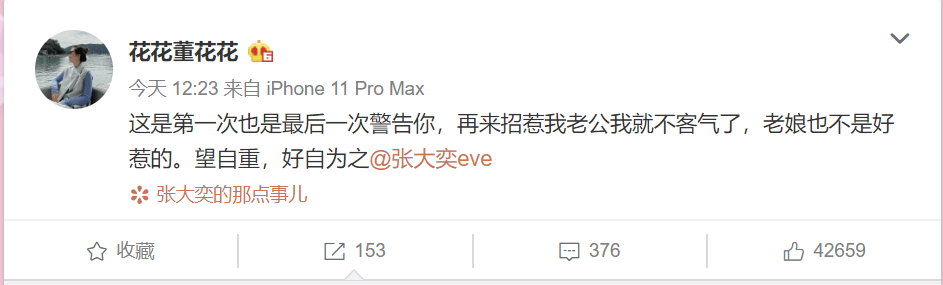 蔣總裁的正室夫人在微博喊話某網紅張某奕,言論間頗不客氣,「這是第一次也是最後一次警告你,再來招惹我老公我就不客氣了,老孃也不是好惹的。望自重,好自為之。」直接送自己老公上熱搜,可謂傻妻滅夫。
