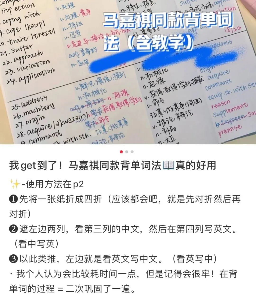 微博上,新東方在線和城市畫報與馬嘉祺官方後援會,還曾共同發起“找個學霸馬嘉祺當偶像”的話題,獲得了近5000萬閲讀。小紅書上,至今還流傳着他的“馬氏背單詞法”,許多粉絲都在用馬嘉祺分享的方法背單詞。