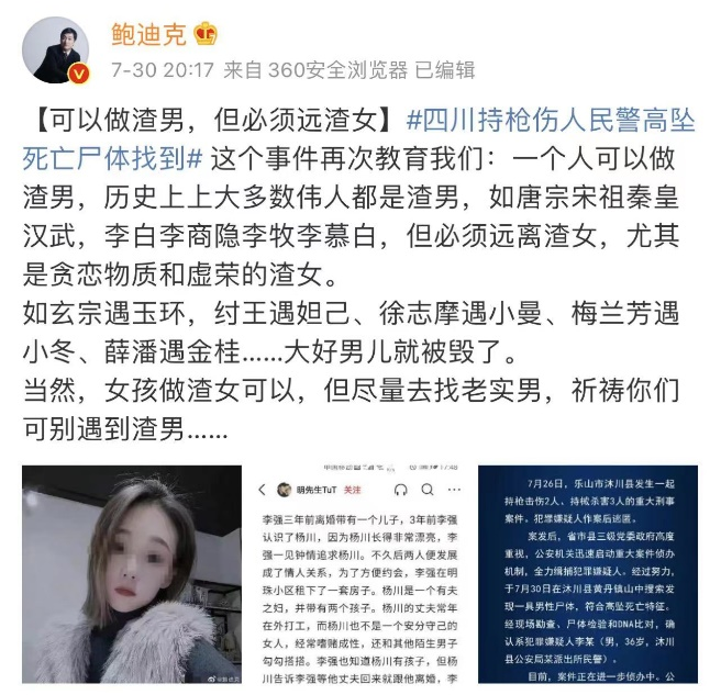 當然也有不同聲音:你又不瞭解對方,憑什麼指摘這個女人是渣女?就算是對方是渣女,可你做為一個肩負重任的警官,怎麼也不能濫殺,對吧?
