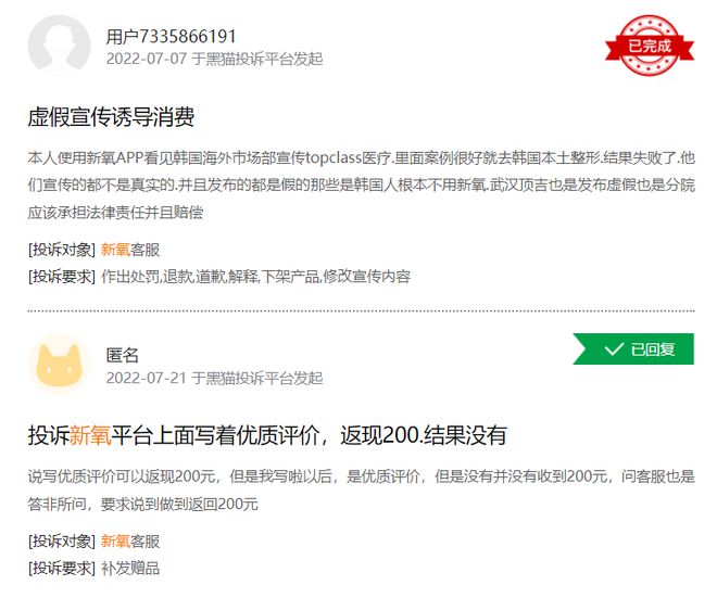 天貓投訴平台顯示,與新氧有關的投訴達三百多條,包括“虛假宣傳誘導消費”、“評價沒有返現”、“沒做的項目沒有退款”、“產品無效果”、“醫美機構非法經營”、“平台和商家聯合欺騙消費者”等多個內容。