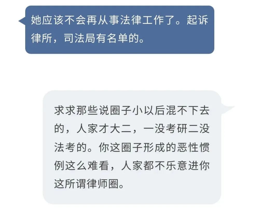 此陣營的網友認為,法律圈是互通的。起訴律所,又是個沒有根基的新人,無疑斷送了自己的前程,以後做不了律師。