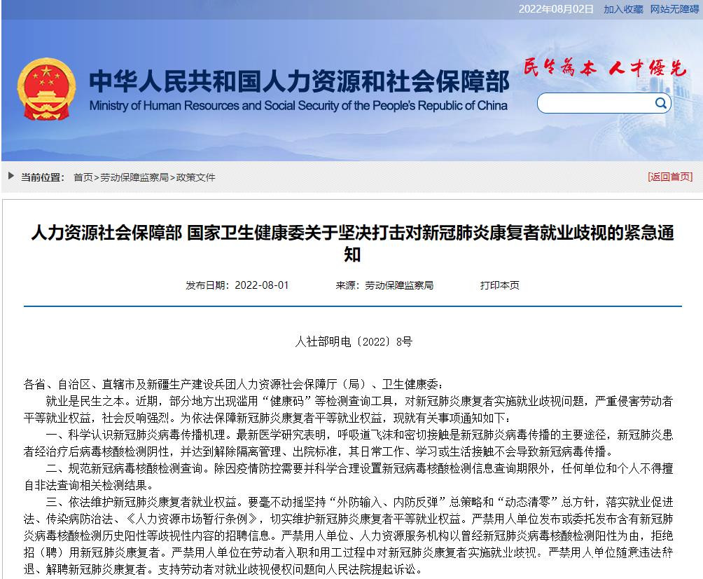 8月1日,人社部和國家衞健委發佈通知,堅決打擊對新冠肺炎康復者的就業歧視。與此同時,多地多部門也明確,不得歧視新冠康復者。