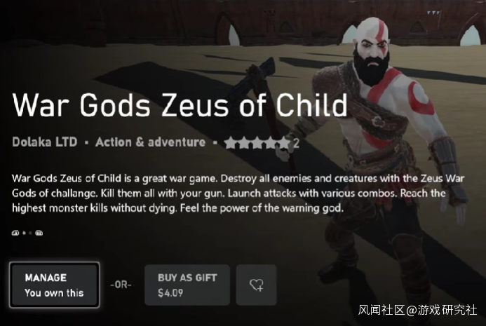 很快就有玩家和網友發現了這個Xbox版《戰神》的存在。打開該遊戲的頁面。赫然可見其介紹——“本作是一個偉大的戰爭遊戲”“用你的槍擊殺它們(沒錯是GUN,不是別的武器)”“在不重來的情況下擊殺更多的怪物,親自感受下警告上帝的力量”…….
