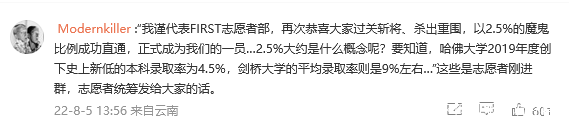 “我謹代表FIRST志願者部,再次恭喜大家過關斬將、殺出重圍,以2.5%的魔鬼比例成功直通,正式成為我們的一員…2.5%大約是什麼概念呢?要知道,哈佛大學2019年度創下史上新低的本科錄取率為4.5%,劍橋大學的平均錄取率則是9%左右…”