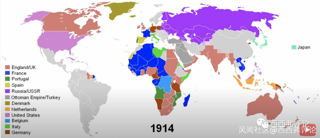這是1914年,一戰前的西方。歐洲人控制了北美、歐洲、亞洲大部分領土、非洲幾乎全部、大洋洲全部。獨立的南美洲,也是歐洲人的後裔和混血所佔據。中國是半殖民地。歐洲人在400多年擴張後,到一次大戰前,統治的土地面積恐怕差不多接近1億平方公里。佔全球總面積三分之二。翻了30倍。