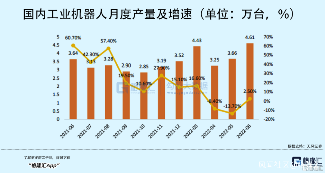 我國已經連續8年成為全球最大的工業機器人消費國,2021年中國工業機器人產量達36.6萬台,同比增長54.4%;銷量為25.6萬台,同比增長48.8%。根據國家統計局數據,今年6月工業機器人單月產量4.61萬台,同比增長2.5%,在4、5月錄得負增長後重回正增長,恢復明顯,呈現出良好的增長韌性。