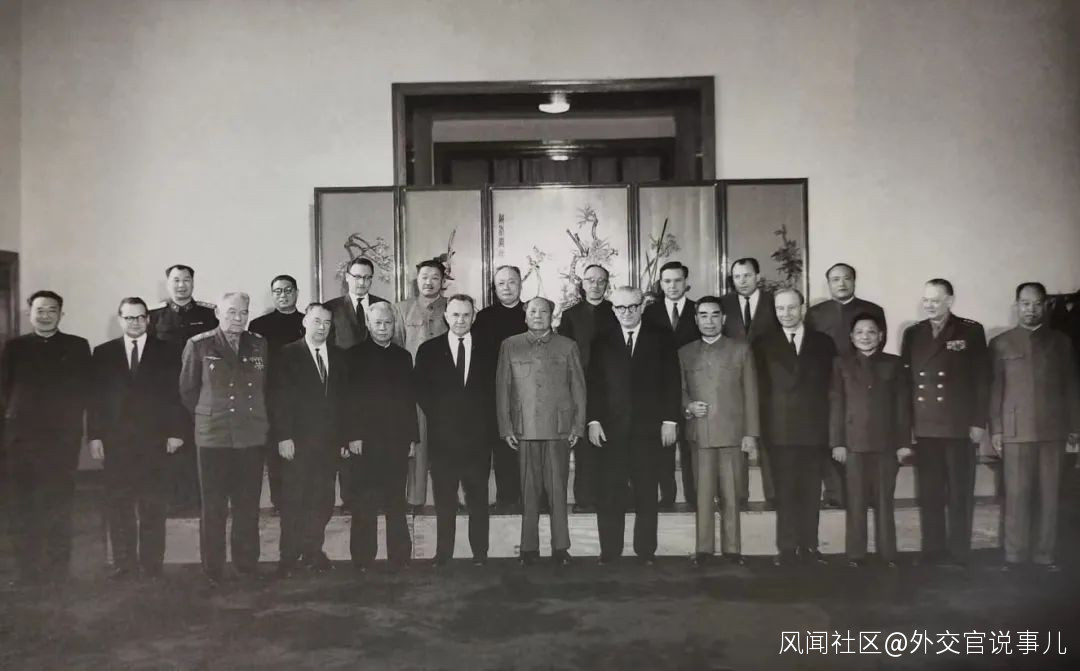 1965年2月,毛澤東主席、劉少奇主席、周恩來總理等會見途經北京的蘇聯部長會議主席柯西金(前排左六)。前排右六為蘇共中央書記安德羅波夫。(《新中國外交五十年》圖)
