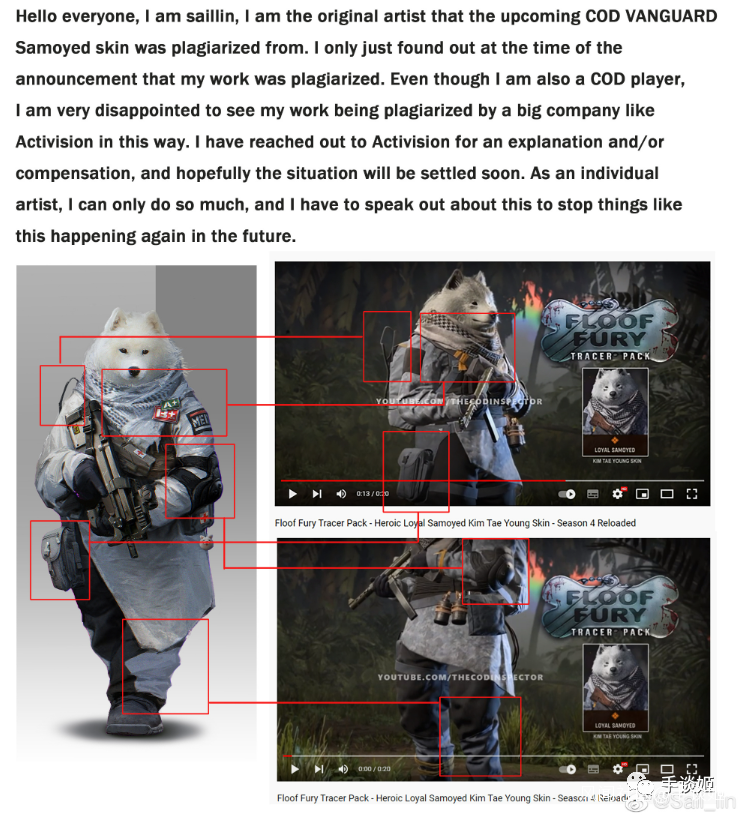 7月28日凌晨,國內畫師saillin表示,動視抄襲了他2019年設計的人物形象。