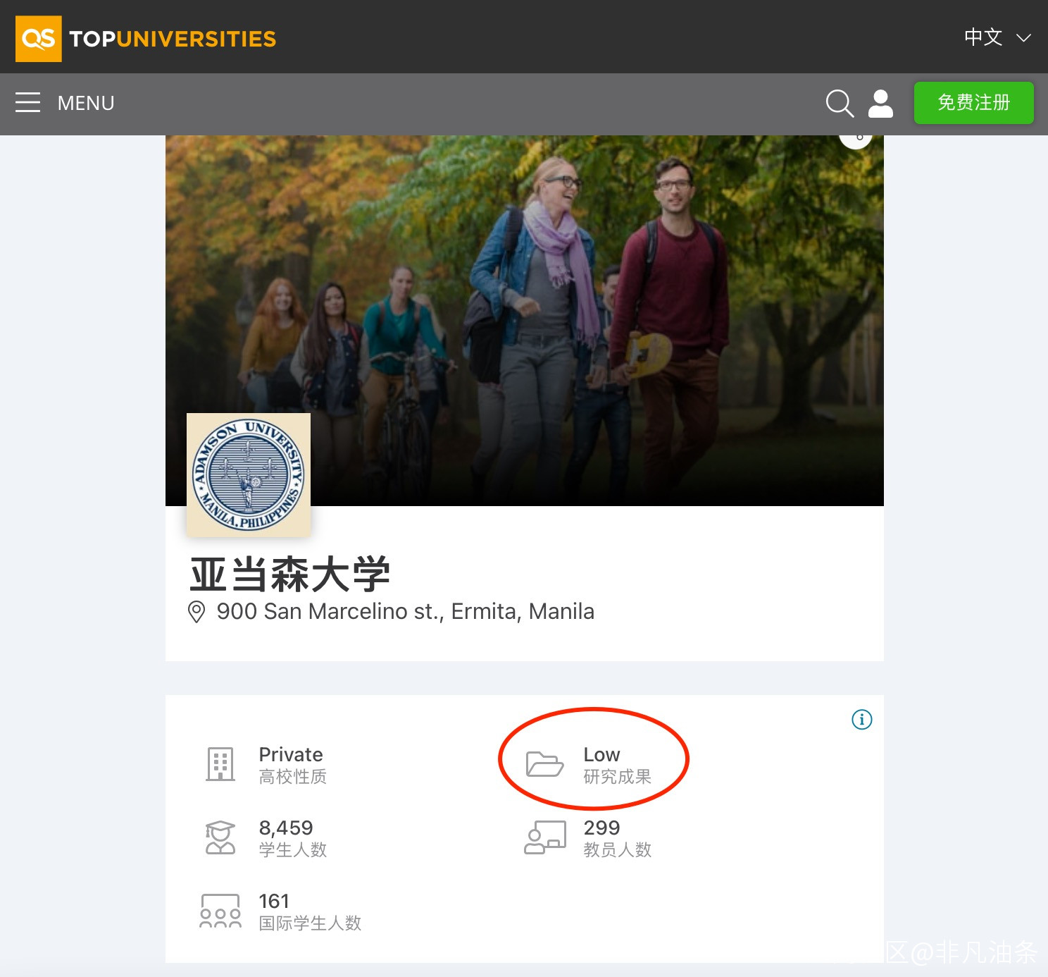 在QS中國的官網上,亞當森大學的研究成果水平被註明為“Low”