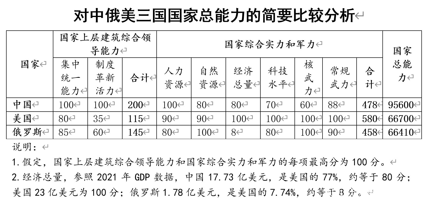 參照2021年GDP,美國23萬億美元,最高,為100分;中國(依據2021年國家統計公報GDP 114.3670萬億人民幣,按當年人民幣兑美元平均匯率6.4515換算)17.7272萬億美元,是美國的77%,為80分;俄羅斯1.78萬億美元,是美國的7.739%,為8分。