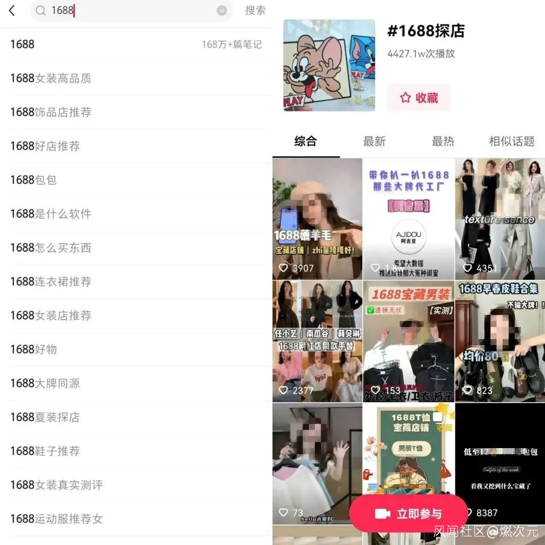 近兩年,1688一躍成為了社交平台上的網紅,豆瓣上“1688源頭工廠發掘機”小組致力於挖掘源頭好物,不讓中間商賺差價,而小紅書上以1688為關鍵詞搜索,相關筆記高達168萬篇,抖音平台的1688探店話題播放量達到4427萬次。