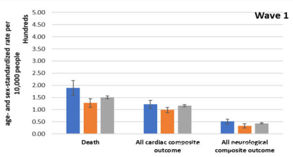 加拿大第3波疫情alpha毒株(2021.3.5~2021.6.30)的死亡率、心臟病、神經系統併發症。三項指標均顯示新冠病毒對華裔造成的危害最嚴重。藍色柱子是華裔,橙色柱子是南亞裔,灰色柱子是其他加拿大人。