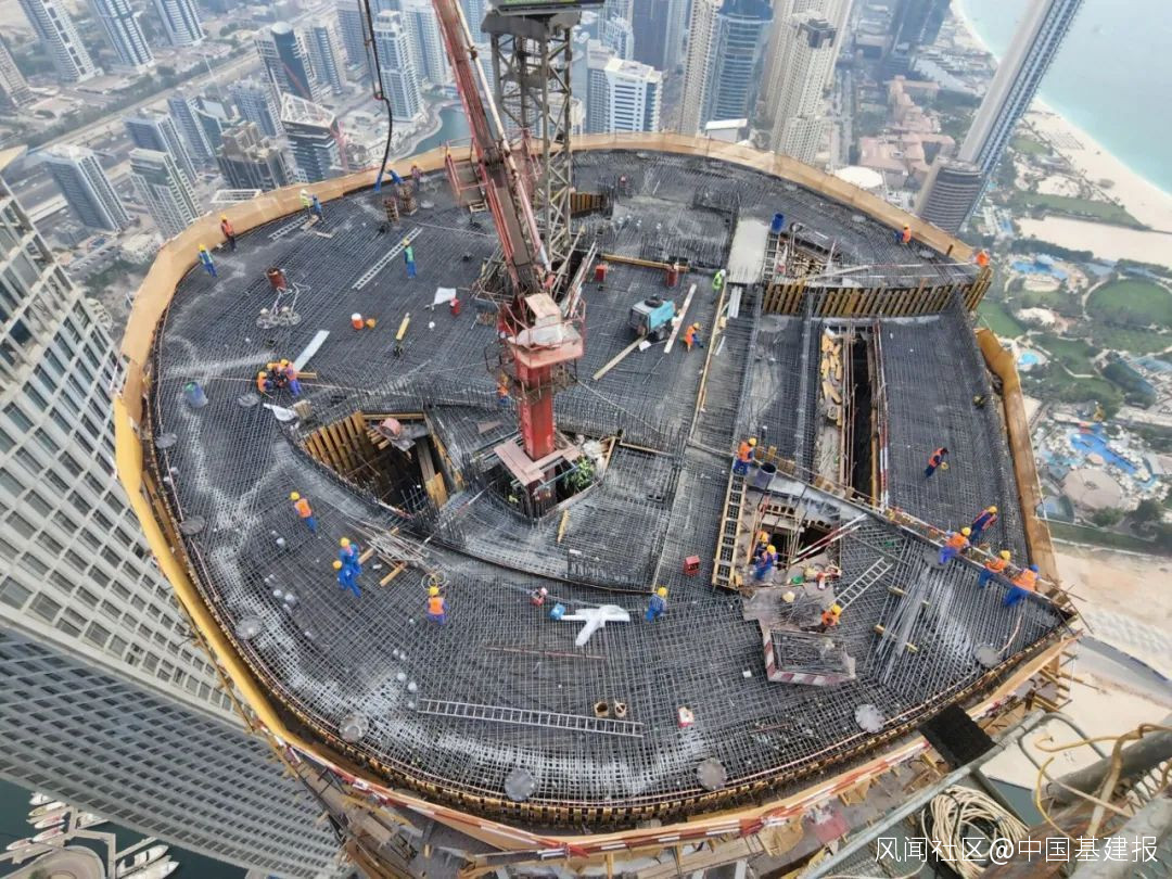 通過採用泵送自密實混凝土,精密計算地泵選型、泵管線路設計、壓力,嚴格控制混凝土塌落度和温度等措施,項目團隊成功解決了高温下超高層建築混凝土垂直運輸的難題,順利保證向300多米高空安全輸送混凝土。