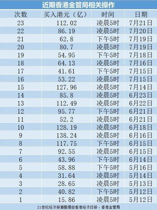 自5月12日至8月2日,香港金管局已27次出手買入港元,共耗資1861.7億港元。