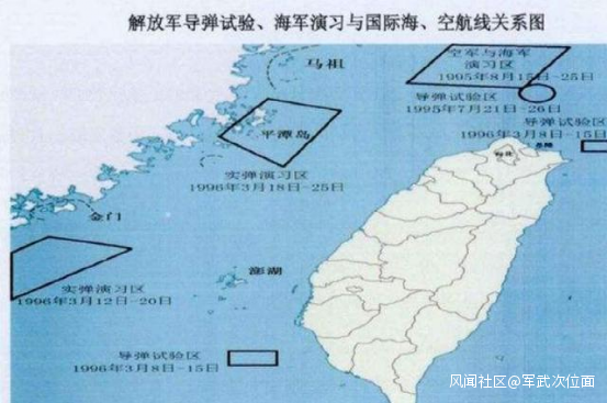 從1995年7月份開始,中國就在東海海域進行軍事演習,先是試射了6枚東風15導彈,飛過了台灣島上空,導彈全部命中目標。同年8月,南京軍區又在海上進行大規模的演習,更加展示了我國的決心。