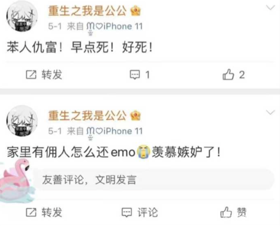 在她的另一個賬號“重生之我是公公”中,她則宣稱,網暴伊奈是因為“仇富”以及“憑什麼她有這麼多粉絲”而心生嫉妒。