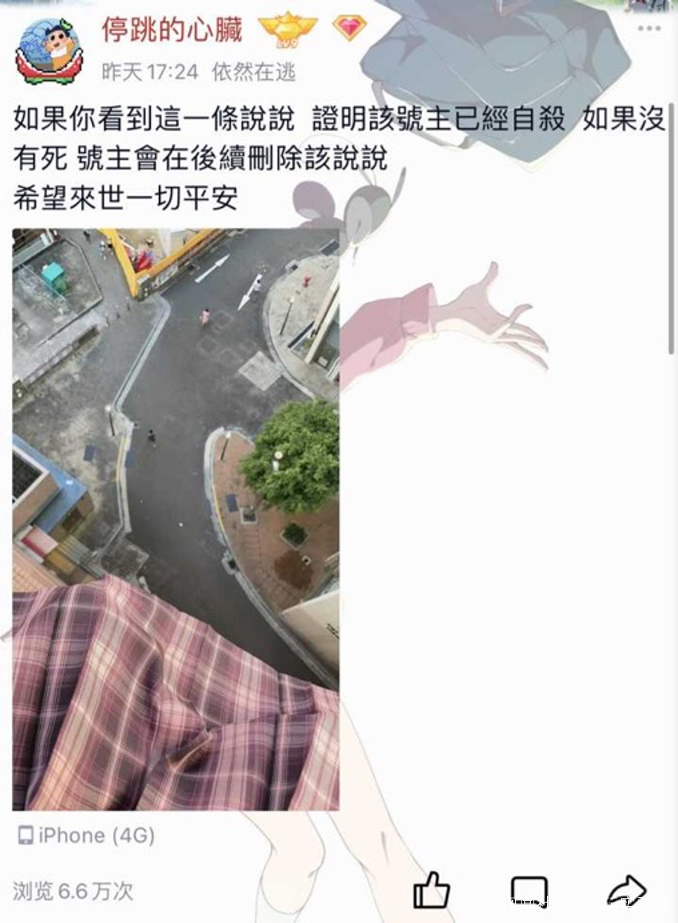 在直播間眾人的圍觀中,她來到十幾層樓的樓頂,用椅子和書本墊着爬上護欄,翻身一躍而下。