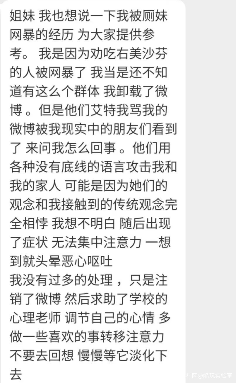原來在此之前,她已經被一個叫做**“廁妹”**的亞文化羣體,在微博和QQ羣、B站等平台謾罵、侮辱了數月之久。