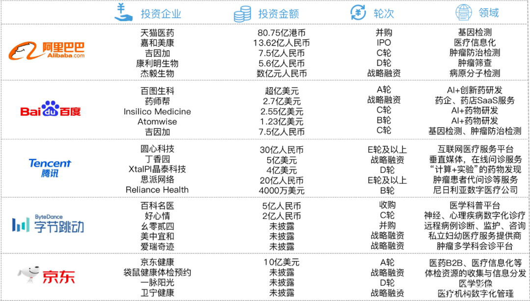 自2020年以來五家互聯網大廠金額最大的幾筆醫療領域投資,同時挑選它們最具有代表性的合作動作,來看一看什麼項目是大廠醫療“基本款”****,什麼又是“搭配款”。