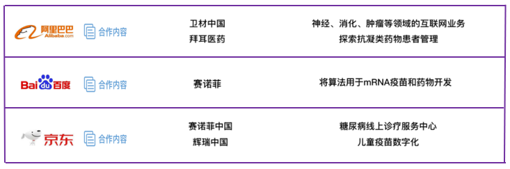 在這場找朋友的遊戲裏,阿里找到了衞材和拜爾;百度找到了賽諾菲;京東找到了輝瑞和武田製藥。