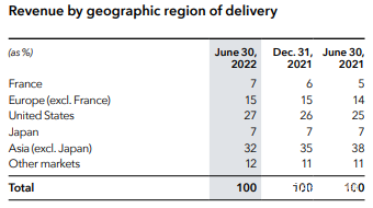 根據LVMH中期財務報告顯示,截至2022年6月30日,按交付的地理區域分類,由於2022年上半年尤其是在中國的疫情防控政策,亞洲(不包括日本)對集團收入的相對貢獻率下降了6個百分點,由2021年同期的38%降至32%,相對貢獻率有所下降,但依舊維持在第一。
