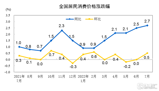 2022年7月份,全國居民消費價格同比上漲2.7%。全國居民消費價格環比上漲0.5%。