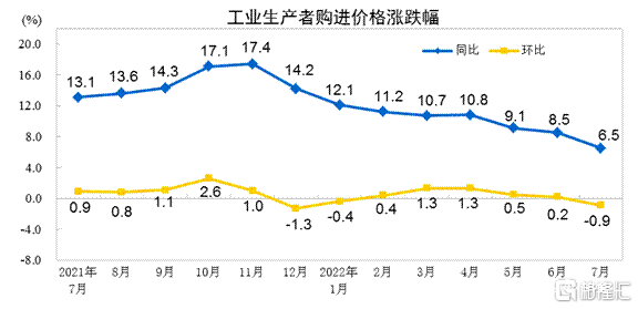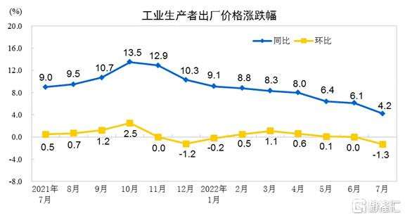 2022年7月份,全國工業生產者出廠價格同比上漲4.2%,環比下降1.3%;工業生產者購進價格同比上漲6.5%,環比下降0.9%。1—7月平均,工業生產者出廠價格比去年同期上漲7.2%,工業生產者購進價格上漲9.8%。