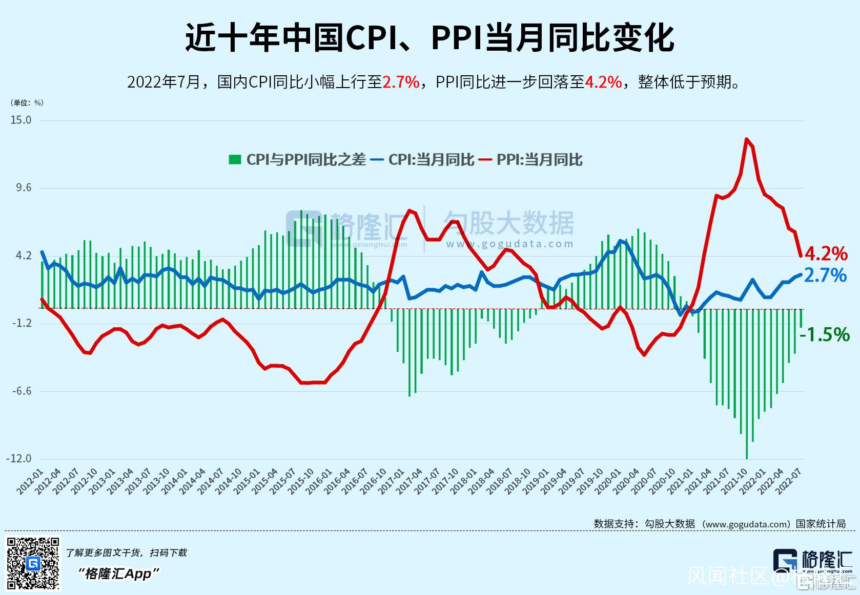 國家統計局今天發佈了2022年7月份全國CPI(居民消費價格指數)和PPI(工業生產者出廠價格指數)數據。中國7月CPI同比2.7%,預期2.90%,前值2.50%。7月CPI環比0.5%,前值0,預期0.5%。PPI同比增長4.2%,預期4.8%,前值6.1%;環比下降1.3%,前值為持平。