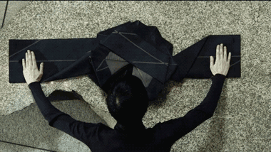 於是,他利用專為摺紙服飾設計的再生聚酯纖維,用一塊簡單布料,做出了適合所有人穿的衣服。