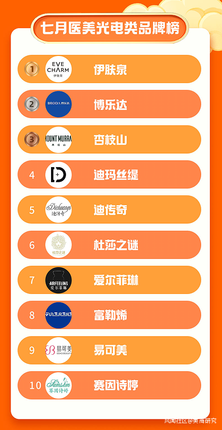 在7月美商指數醫美光電類品牌榜中,伊膚泉、博樂達、杏枝山品牌拿下本期光電類品牌榜單前三,除杏枝山外,其餘兩個品牌均是國內品牌。