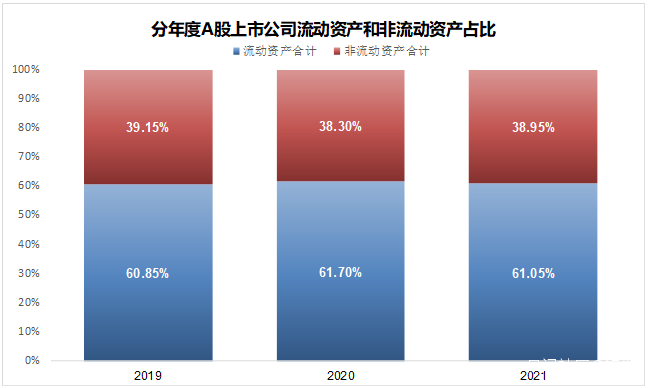 A股上市公司流動資產和非流動資產的比值平均大約在6:4左右。過去三年流動資產的佔比略有提升,但並不顯著。實際上企業財務報表項目的歸屬調整,包括會計準則的變更,都會影響到構成。這個比率的變化,我們可以理解成基本上是穩定的。
