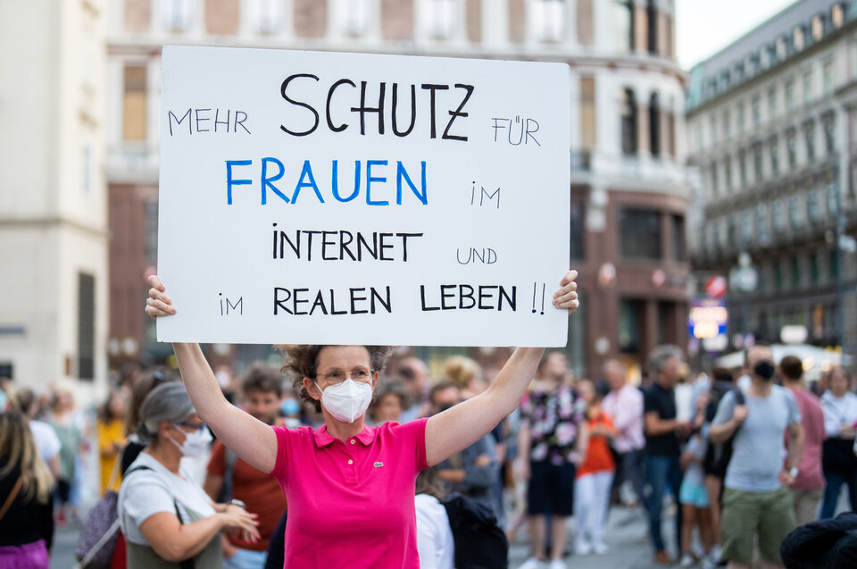 ● 維也納悼念集會上一位參與者手舉標語:在網絡和現實中給女性以更多保護 / OE24