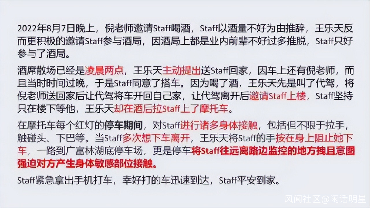 兩天前的8月8日,一個名叫“明川西”網友,在網上爆料,小藝人王樂天性騷擾年輕女孩。該網友説:2022年8月7日的晚上,倪老師(沒有説倪老師的具體情況)約請年輕女性Staff一起聚餐,Staff不想參加,就以自己的酒量不好為理由,進行推脱。而這個時候,王樂天出面,積極邀請Staff參與酒局,staff礙於王樂天的面子,還因為參加酒局的都是業內的前輩,Staff不好意思堅辭不去,只好參加了這個聚餐。