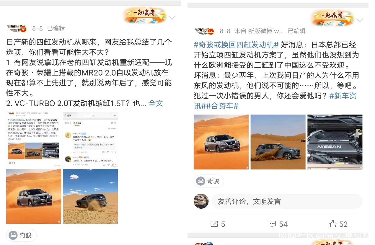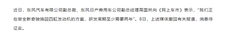 近日,國內某媒體報道稱:東風日產有限公司副總裁、東風日產乘用車公司副總經理向該媒體表示,正在做全新奇駿換回四缸發動機的方案,研發週期至少需要兩年。