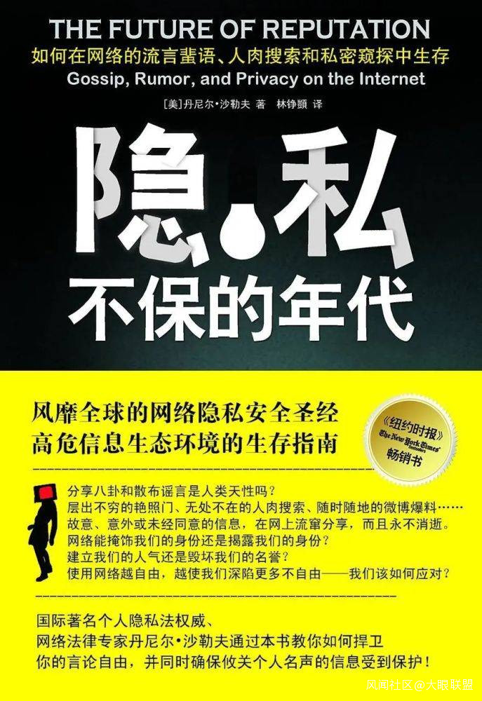 15年前丹尼爾•沙勒夫在出版的一本書《隱私不保的年代》中,就在探討“如何在網絡的流言蜚語、人肉搜索和私密窺探中生存?”這樣的話題,15年過去了,書中很多的例子已經過時,但描述的現象和現在也相差無幾。