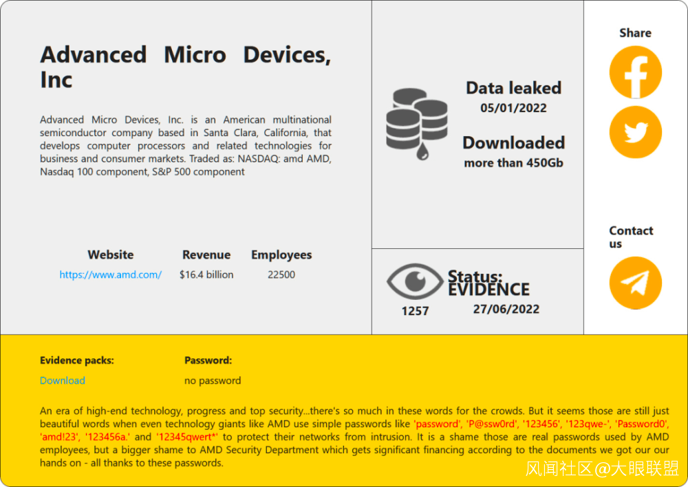 兩個月以前,芯片大廠AMD公司450Gb數據泄露事件被曝光。而黑進其內部系統的黑客聲稱,破譯AMD內部員工設置的登陸權限密碼只用了不到5分鐘。這並非用了什麼高科技的黑客技術,相反,只是因為AMD員工設置的密碼過於簡單,簡單到直接用“password”“123456”這種毫無腦回路的排列組合做密碼。