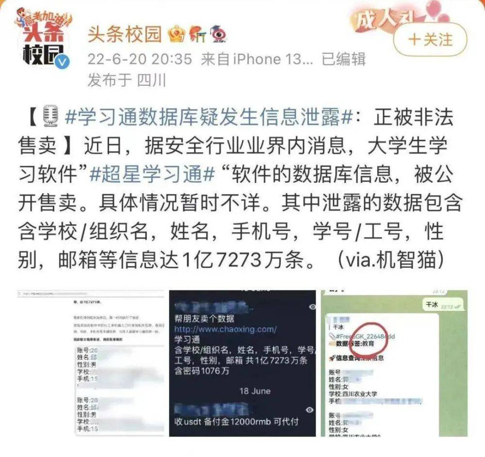 6月,大學生學習軟件超星學習通被曝數據庫信息泄露,其中包含學校/組織名、姓名、手機號、學號/工號、性別、郵箱、密碼等個人隱私,泄露數據高達1.7億條,並且在境外平台被公開售賣,引發社會各界強烈關注和討論。