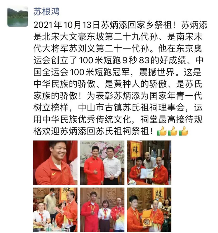 不過根據中新網在昨天晚些時候的相關報道,蘇炳添所在的古一村蘇氏祖祠理事會會長(蘇氏宗族族長)蘇根鴻表示,根據族譜,蘇炳添為蘇軾第29代孫,村裏很多人都是蘇東坡的後代。