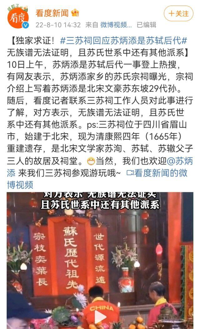 此前為了求證蘇炳添是否為蘇軾後人,有媒體採訪了四川三蘇祠的工作人員,對方稱沒有族譜所以無法證明蘇炳添是蘇軾後代,而且蘇氏世系中還有其他派系。(三蘇祠位於四川眉山市,是北宋文學家蘇洵、蘇軾、蘇轍父子三人的故居及祠堂)
