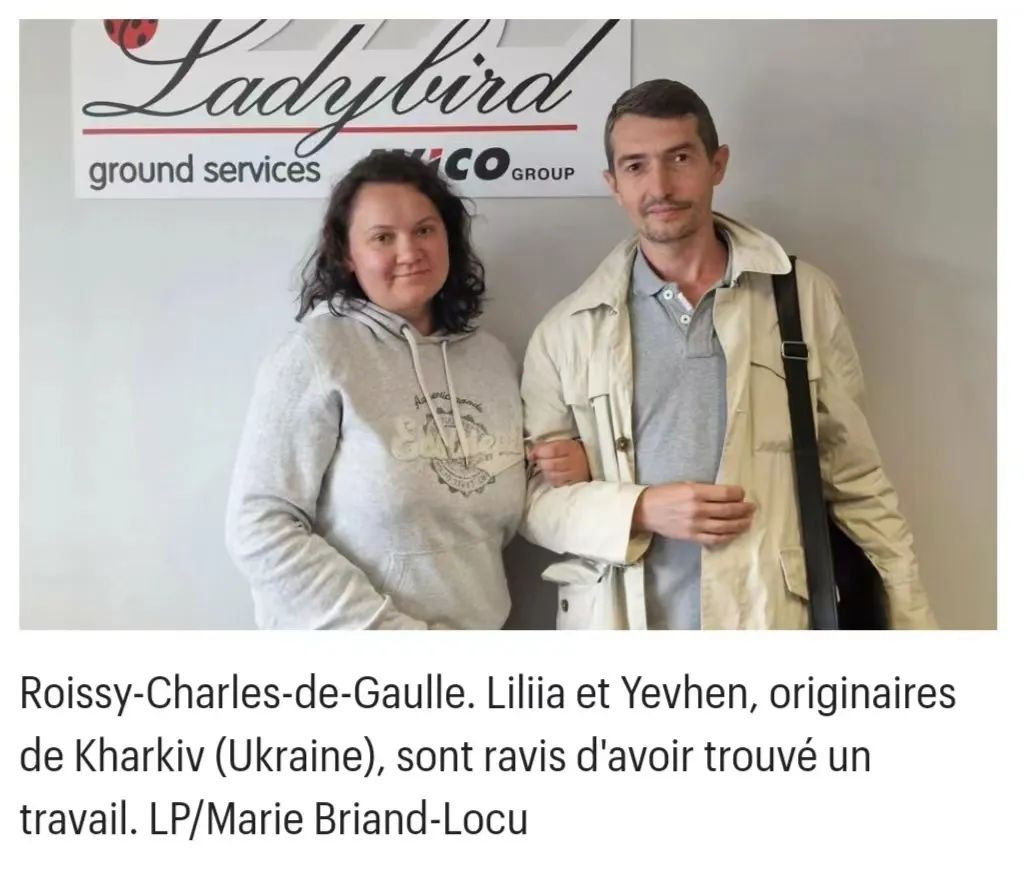 《巴黎人報》報道,Liliia 和 Yevhen正在接受由魯瓦西戴高樂機場平台的Pôle emploi資助的培訓,為專門從事航空運輸服務的Ladybird Avico公司清潔機場跑道。這位餐館前老闆即將重新轉行做機場清潔,這也是他們遠離戰爭的新生活的開始。