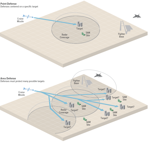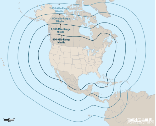 以美國本土周邊起算,不同射程的巡航導彈需要達到的發射線