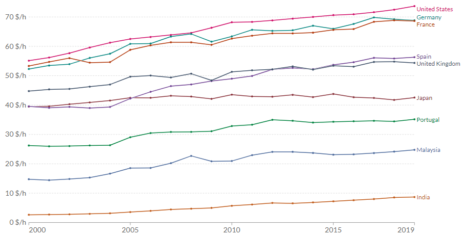 法國企業為了逃避高昂的加班費,寧願僱用時間更靈活的兼職員工。根據世界銀行的一項數據,法國的兼職工作佔所有工作的比例,從2000年的29%暴漲到2021年的40%。