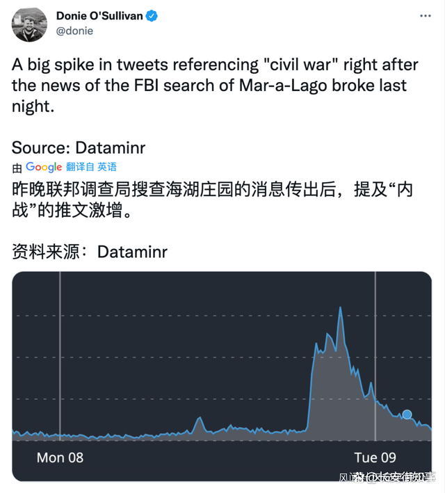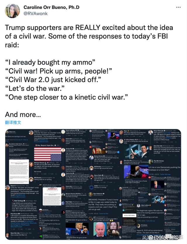 當FBI對特朗普抄家之後,美國社交網絡上關於“內戰”(civil war)的發帖量暴增。特朗普的支持者對內戰“非常興奮”,有人發帖稱“內戰2.0剛剛開始”、“我已經買了彈藥”、“快拿起武器”、“我們去打仗吧”……然後這位Ricky Shiffer老兄就付諸實踐了。