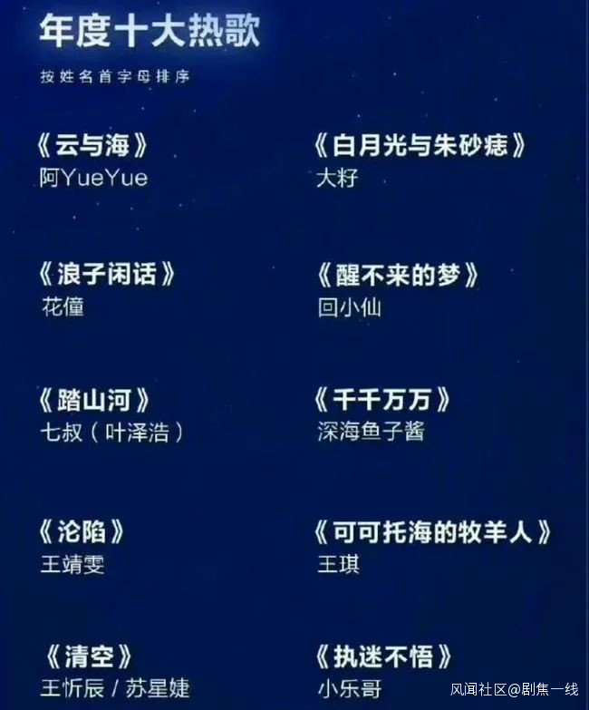 事實是,像《雲與海》《白月光與硃砂痣》《浪子閒話》這些走紅於抖音的歌曲,確實在主流音樂平台擁有極高的播放量,它們或許不夠“高級”,但背後站着大批聽眾。説到底,這個榜單被抨擊的主因,是聽歌的大眾與當下在網上擁有話語權的年輕人之間的審美正在加速割裂。