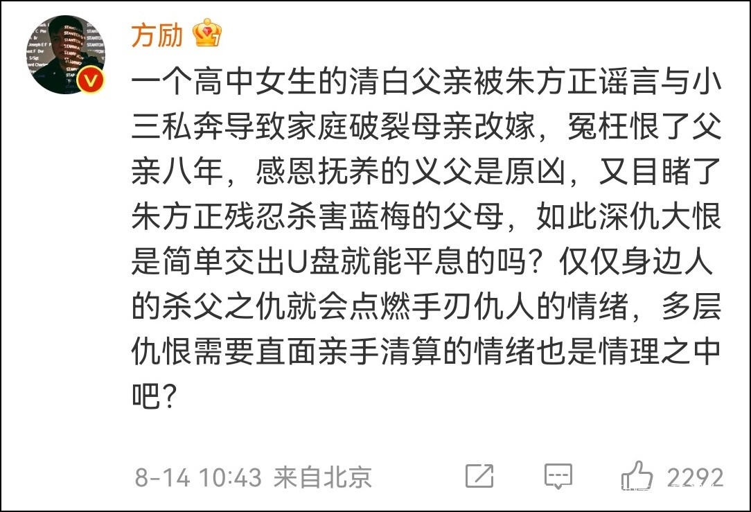 製片人方勵評論:把證據交給警方並不足以平息女主的憤怒,她選擇親自報仇很合理。